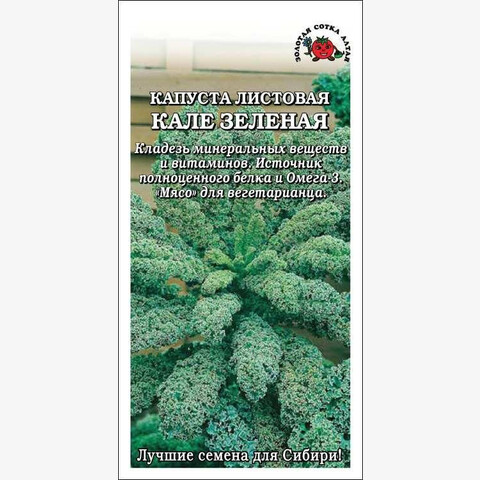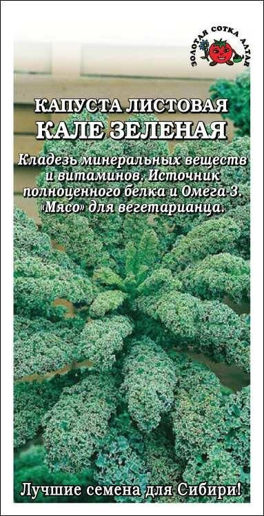 Декоративный сорт листовой капусты с большими ажурно-кудрявыми листьями зеленого цвета. Кочан не образует. Высота растения 60-80 см. Кале обладает мягким и сладким вкусом, богата витаминами, минеральными веществами и кальцием, содержит полноценный легко усваиваемый белок и Омега-3, по содержанию аминокислот идентична мясу. Используется в свежем виде (предпочтительнее), для приготовления первых и вторых блюд.