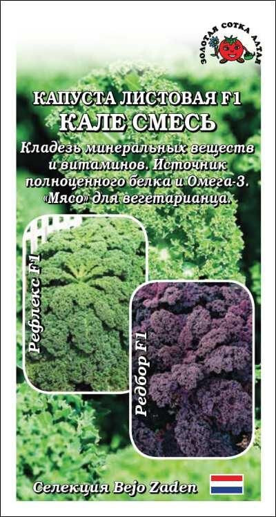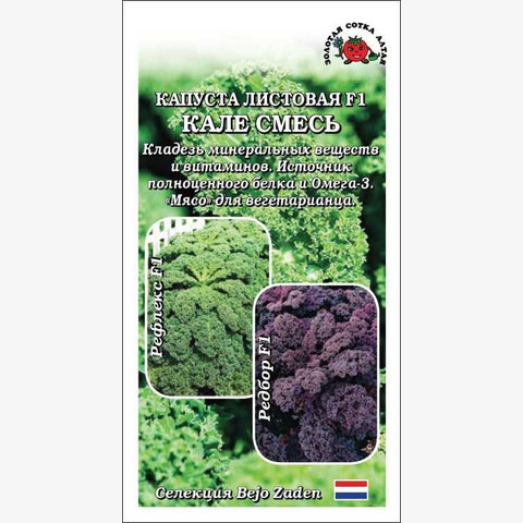 Декоративная капуста, не образующая кочана. Листья ажурно-кудрявые, содержат огромное количество витаминов и минеральных веществ, полноценный легкоусваиваемый белок и Омега-3. Кальция в ней больше, чем в молоке, а по содержанию аминокислот кале идентична мясу. Использовать рекомендуется в свежем виде, а также для приготовления первых и вторых блюд. Рефлекс F1 – среднепоздний, высотой до 80 см, лист серо-зеленый. Редбор F1 – поздний, высотой до 80 см, лист красно-фиолетовый.