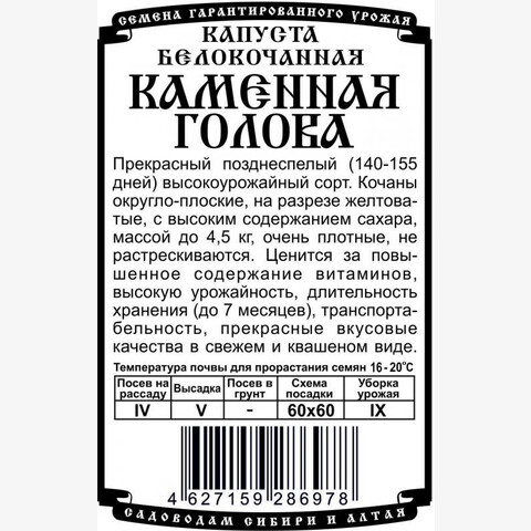 Прекрасный позднеспелый (140-155 дней) высокоурожайный сорт. Кочаны округло-плоские, на разрезе желтоватые, с высоким содержанием сахара, массой до 4.5 кг, очень плотные, не растрескиваются. Ценится за повышенное содержание витаминов, высокую урожайность, длительность хранения (до 7 месяцев), транспортабельность, прекрасные вкусовые качества в свежем и квашеном виде.
