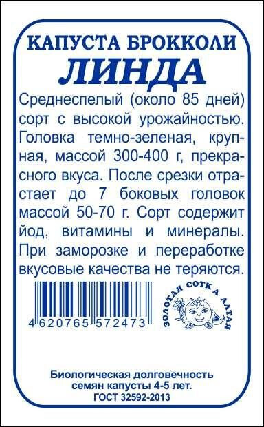 Среднеспелый сорт с высокой урожайностью. От всходов до созревания около 85 дней. Растение среднерослое. Головка темно-зеленая. массой 300-400 г, средне-бугристая, без кроющих листьев, обладает прекрасным вкусом. После срезки отрастает до 7 боковых головок массой 50-70 г. Сорт используется в свежем виде, для переработки и заморозки, после чего вкусовые качества не теряются.