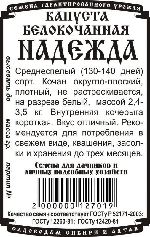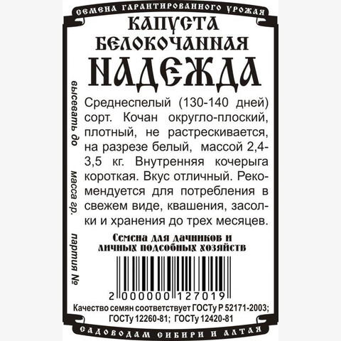 Среднеспелый (130-140 дней) сорт. Кочан округло-плоский, плотный, не растрескивается, на разрезе белый, массой 2,4- 3,5 кг. Внутренняя кочерыга короткая. Вкус отличный. Рекомендуется для потребления в свежем виде, квашения, засолки и хранения до трех месяцев.
