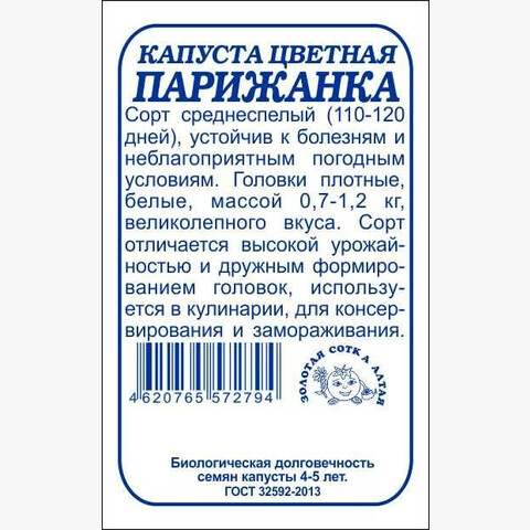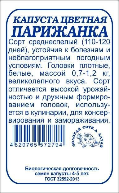 Сорт среднеспелый (110-120 дней), устойчив к болезням и неблагоприятным погодным условиям. Головки плотные, белые, массой 0,7-1,2 кг, великолепного вкуса. Сорт отличается высокой урожайностью и дружным формированием головок, используется в кулинарии, для консервирования и замораживания.