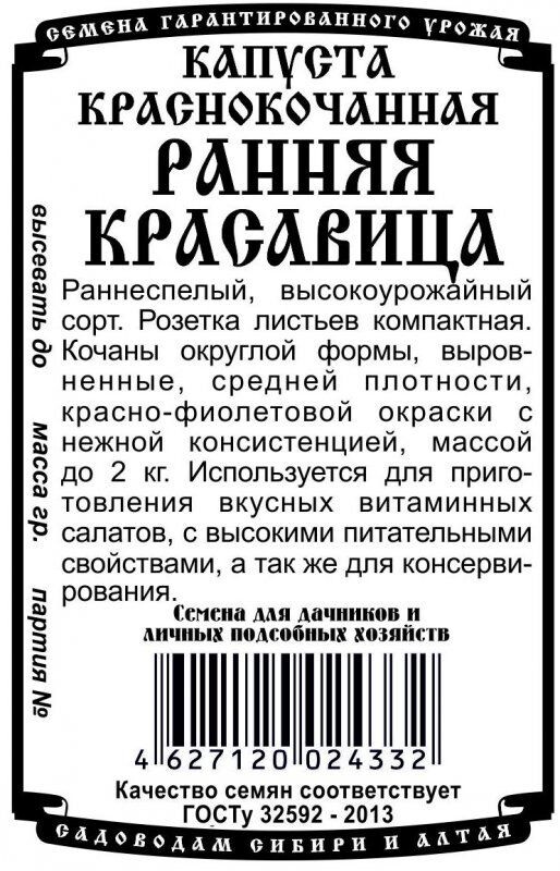 Раннеспелый, высокоурожайный сорт. Розетка листьев компактная. Кочаны округлой формы, выровненные, средней плотности, красно-фиолетовой окраски с нежной консистенцией, массой до 2 кг. Используется для приготовления вкусных витаминных салатов, с высокими питательными свойствами, а так же для консервирования.