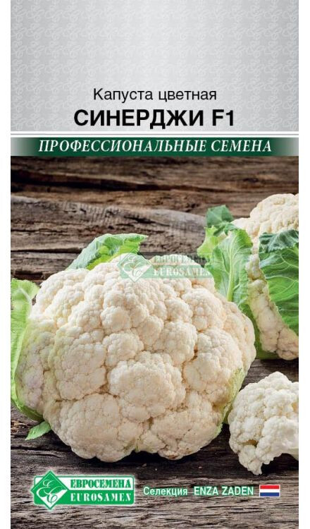 Цветная капуста – невероятно полезный и вкусный овощ, содержит больше полезных веществ, чем любой другой вид капусты. Её родной дом – Средиземноморье, а культивируется она почти во всём мире. Почему капусту назвали цветной и как она еще называется? Цветной она называется потому, что её головка (кочан) представляет собой большое соцветие, которое состоит из нескольких тысяч цветоносных побегов, прижатых друг к другу. Именно это соцветие принято употреблять в пищу на раннем этапе его развития. Синерджи F1 - средний урожайный гибрид цветной капусты для конвейерной уборки с раннего лета до поздней осени, период созревания 72-75 дней. Растение мощное, компактное, с сильной корневой системой и устойчивостью к стрессовым факторам. Темно-зеленые плотные листья расположены вертикально, прекрасно закрывают головку от солнца. Подходит для переработки и заморозки, благодаря однородным, легко отделяемым друг от друга соцветиям. Головки белоснежного цвета куполообразной формы, ровные, плотные, массой 1,6-2,0 кг. Гибрид характеризуется очень высоким выходом товарной продукции, отличной само укрывной способностью и приподнятой головкой, что облегчает сбор урожая.