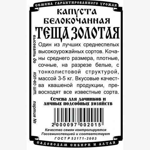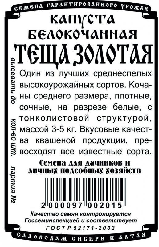 • Один из лучших среднеспелых высокоурожайных сортов. Кочаны среднего размера, плотные, сочные, на разрезе белые, с тонколистовой структурой, массой 3-5 кг. Вкусовые качества квашеной продукции, превосходят все известные сорта.