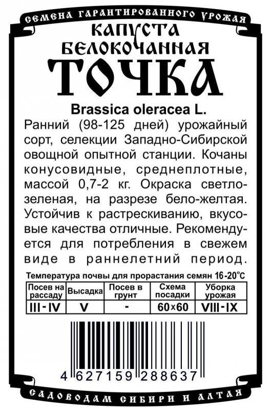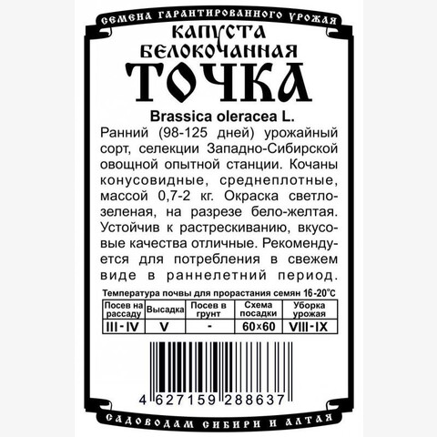 Ранний (98-125 дней) урожайный сорт, селекции Западно-Сибирской овощной опытной станции. Кочаны конусовидные, среднеплотные, массой 0,7-2 кг. Окраска светло-зеленая, на разрезе бело-желтая. Устойчив к растрескиванию, вкусовые качества отличные. Рекомендуется для потребления в свежем виде в раннелетний период.