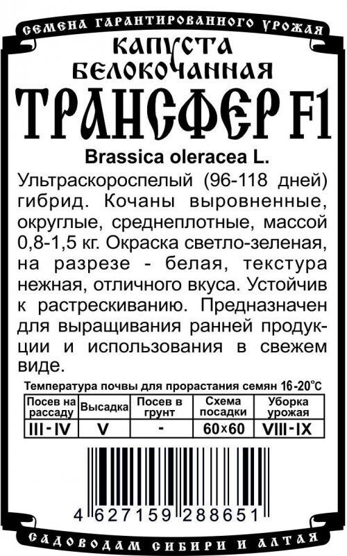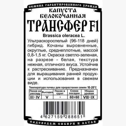 Ультраскороспелый (96-118 дней) гибрид. Кочаны выровненные, округлые, среднеплотные, массой 0,8-1,5 кг. Окраска светло-зеленая, на разрезе - белая, текстура нежная, отличного вкуса. Устойчив к растрескиванию. Предназначен для выращивания ранней продукции и использования в свежем виде.