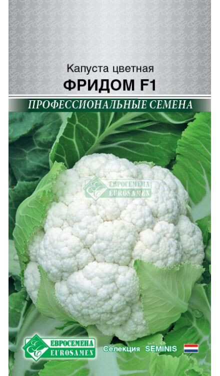 Цветная капуста – невероятно полезный и вкусный овощ, содержит больше полезных веществ, чем любой другой вид капусты. Её родной дом – Средиземноморье, а культивируется она почти во всём мире. Почему капусту назвали цветной и как она еще называется? Цветной она называется потому, что её головка (кочан) представляет собой большое соцветие, которое состоит из нескольких тысяч цветоносных побегов, прижатых друг к другу. Именно это соцветие принято употреблять в пищу на раннем этапе его развития. Фридом F1 –среднеранний высокоурожайный гибрид (аналог Фремонт F1) , отличающийся очень высоким качеством головок и высокой устойчивостью к стрессам. Головки глубокие, гладкие, округлой формы, очень плотные, белоснежные. Благодаря выдающейся силе роста растения, возможно внесение меньших доз азотных удобрений.