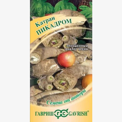 Двух-трехлетняя культура, выращиваемая как улучшенный аналог хрена. Корни катрана богаче по химическому составу и вкусовым качествам, а также более технологичны при переработке (корешок не ветвится). Сорт рекомендован для использования в свежем и переработанном виде, как корней, так и листьев. Розетка листьев полуприподнятая, хорошо облиственная. Листовая пластинка сизо-зеленая обратнояйцевидной формы перисторассеченная с гладкой поверхностью. Корнеплод конический длиной 40см, диаметром 4 см. Масса корнеплода до 900 г! Окраска коры корнеплода серо-коричневая. Мякоть белая, ароматная, со вкусом и ароматом как у хрена. Посев семян в открытый грунт под зиму или весной после 3-х месячной стратификации. Рекомендуемая схема посадки – 70х40см. Средняя урожайность – 3,90 кг/м2.