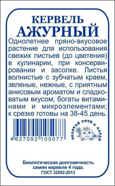 Пряно-вкусовое растение для использования свежих листьев в кулинарии, при консервировании и засолке, а также для заморозки. До уборки на зелень 38-45 дней, до цветения - 75дней. Лист зеленый, волнистый с зубчатым краем, нежный, с приятным анисовым ароматом и сладковатым вкусом. В народной медицине используют зелень и семена.