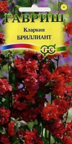 Кларкия Бриллиант однолетнее растение. Куст густоветвистый, объемный, диаметром 35 см. Стебли тонкие, крепкие, 60 см высотой. Листья овальные, сизо-зеленые с красными жилками. Цветки махровые, бриллиантово-красные, до 3-4 см в диаметре, расположены по одному в пазухах листьев. Размножают семенами, которые высевают в апреле в открытый грунт или полутеплый парник. Всходы появляются через 10-14 дней. На постоянное место высаживают в конце мая, закаленные растения легких заморозков не боятся. Посадку в грунт осуществляют обязательно с большим влажным комом земли, выдерживая расстояние между растениям 20-25 см. Для получения компактных, обильно цветущих кустиков верхушки растений прищипывают на высоте 12 см, после чего они хорошо ветвятся и обильно цветут. Кларкия Бриллиант используется для групповых посадок, клумб, рабаток и срезки. Особенно хороша Кларкия Бриллиант в букетах. В срезке у кларкии распускаются все бутоны.