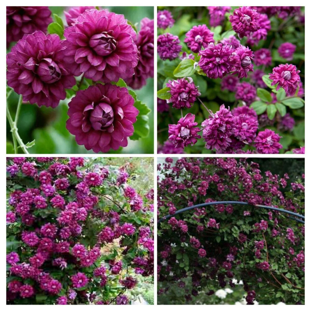 | Клематис фиолетовый (Viticella). Прекрасная среднерослая лиана. Летом покрыта массой махровых, живописных бордовых цветков в стиле ретро. Цветёт с июня по сентябрь. Дорастает до 3-4 м. Нуждается в хорошем освещении, но довольствуется средней почвой. Идеален для посадки у ограждений, пергол, беседок, небольших деревьев, стен. Особенно хорош для закрытия высоких ограждений или старых зданий. Используется как почвопокровное. 3 группа обрезки |