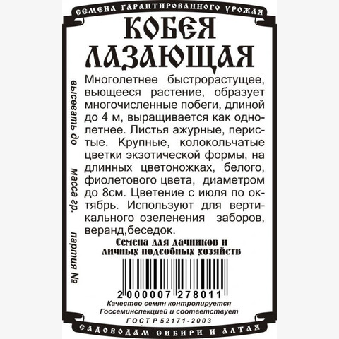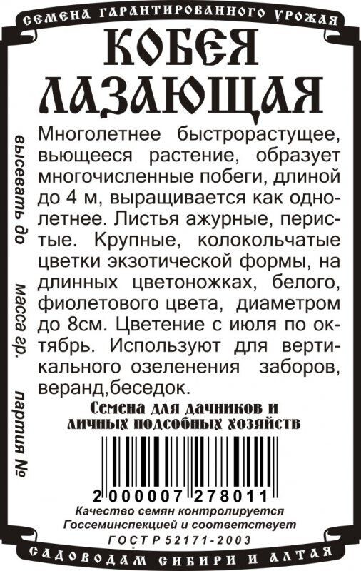 Многолетнее быстрорастущее, вьющееся растение, образует многочисленные побеги, длиной до 4м, выращивается как однолетнее. Листья ажурные, перистые. Крупные, колокольчатые цветки экзотической формы, на длинных цветоножках, белого, фиолетового цвета, диаметром до 8см. Цветение с июля по октябрь. Используют для вертикального озеленения заборов, веранд, беседок