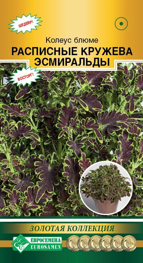 “Расписные Кружева Эсмиральды- уникальный сорт новой серии колеуса блюме Colocha от чешской компании Cerny, отличающийся от семенных классических колеусов необычайно волнистыми и бахромчатыми листьями, мягкими на ощупь. Прекрасная альтернатива вегетативным колеусам, да к тому же, на порядок дешевле. Растения ветвистые, средней компактности, с листьями, приобретающими привлекательные интенсивные окраски, очаровывающие с первого взгляда. Данный сорт отлично растет как на прямом солнце, так и на защищенных местах, переносит отлично и низкие температуры, он превосходно сохраняет свою декоративность до заморозков. Высоко ценится их позднее начало цветения, так как культура, прежде всего, декоративно-лиственная. Колеус особенно пригоден как для посадок в вазоны, крупные горшки и кашпо, так и для посадок в различные цветники открытого грунта. Его с успехом можно культивировать и в качестве комнатной культуры, он неприхотлив и имеет весьма экзотичный и оригинальный внешний вид.