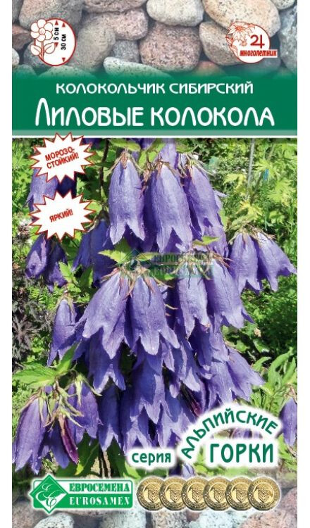 Встретить колокольчика сибирского чаще всего можно на опушках боров и луговых склонах долин рек и балок, на открытых каменистых склонах. Лиловые Колокола-совершенно уникальный и завораживающий, многолетний колокольчик, культивируемый как двухлетнее растение. Оригинальные цветки собраны в великолепные соцветия, что стало лучшей демонстрацией красоты этого благородного цветка. Растение удивительно зимостойкое. Идеально подойдет для оформления рокариев, миксбордеров и альпийских горок. С легкостью, быстро и качественно справится с прорехами и пустотами на клумбе. Не менее эффектно выглядит при оформлении контейнеров и вазонов. Хорошо сочетается с манжеткой, геранью, солнцецветом, гвоздикой. Высота-30 см Диаметр-5 см