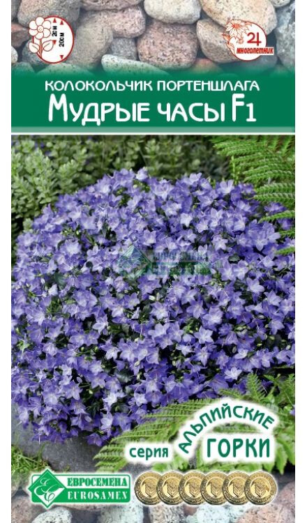 Колокольчик Портеншлага - травянистое растение, относящееся к семейству Колокольчиковые, первым нашёл его во время своих странствий по Европе ботаник Франц фон Портеншлаг. Он привёз его к себе на родину и включил в собственную коллекцию. Позднее колокольчик был описан другим ботаником и назван по имени своего первооткрывателя. В дикой природе колокольчик Портеншлага любит расти в каменистых зонах. Огромные скопления культуры собраны на Балканском полуострове, где растения с комфортом произрастают в скалистых расщелинах, разрастаясь в ширину до 30 см. Мудрые Часы- подушковидный колокольчик, зацветающий в первой половине июня и долго цветущий красивыми синими колокольчиками. Воздушность, легкость, сольно либо в композиции, на клумбе или альпийской горке – он прекрасен везде. Широко применяется для посадки в альпинарии, каменистые садики и различные цветники. Длительное цветение, простейший уход в открытом грунте и отличный иммунитет – главные козыри цветка. Хорошо растет как на солнце, так и в затененном месте.
