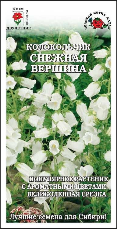 Один из самых популярных видов колокольчиков. Куст прямостоячий, ветвистый, с жестковолосистым стеблем. Цветы белоснежные, крупные, бокаловидной формы, собраны в эффектные пирамидальные соцветия. Аромат приятный, нежный. Цветет на второй год с июня по сентябрь. Используется в различных цветниках, одиночно и группами на газоне, прекрасно подходит для срезки.