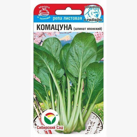 Раннеспелый (от всходов до уборки на зелень 20- 30 дней) сорт листовой репы чаще называемый Японским шпинатом. Традиционно используется в национальных кухнях азиатских стран. Благодаря широкому набору полезных качеств, приятному вкусу и аромату стала популярной у огородников России. Зимой может выращиваться в качестве микрозелени на домашних подоконниках. Розетка листьев прямостоячая, устойчива к преждевременному стеблеванию, состоит из 4-7 листьев, высотой 18 см. Лист темно-зеленый, без опушения, слабоволнистым краем. Молодые ростки комацуны имеют пряный, слегка сладкий вкус, употребляются в свежем виде и обладают нежной, приятной текстурой. Отлично сочетаются с рисом, яйцами, тофу, грибами, морепродуктами и зелёными овощами. В 100 граммах комацуны содержится около 23 ккал. Химический состав характеризуется повышенным содержанием углеводов, клетчатки, белков, витаминов. Листья используют для приготовления овощных салатов, супов, жаркого из мяса, гарниров из овощей, краткосрочного консервирования. Урожайность - 3,6кг/м2.