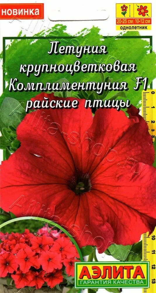 • Комплиментуния – стильное, эффектное и очень изящное растение. Это романтичный, практичный выбор и комплимент на языке цветов. Комплиментуния – эксклюзивный гибрид (новая петуния) с крупными цветками и суперобильным цветением. Украсит любой цветник и будет долго дарить радость и восхищение. Благодаря наличию гена мужской стерильности семян не завязывает, направляя всю энергию на формирование новых цветков. Форма растений кустовая, со склонностью к трейлингу: ширина больше высоты. Высота 20-25 см, ширина 40-50 см. Быстро разрастается. Растения устойчивы к болезням, выдерживают дождливую и ветреную погоду, переносят кратковременные заморозки до –5°С и экстремальную жару до +40°С без потери декоративности.