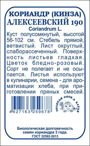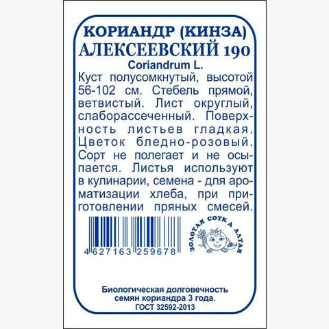Куст полусомкнутый, высотой 56-102 см. Стебель прямой, ветвистый. Лист округлый, слаборассеченный. Поверхность листьев гладкая. Цветок бледно-розовый. Сорт не полегает и не осыпается. Листья используют в кулинарии, семена - для ароматизации хлеба, при приготовлении пряных смесей.