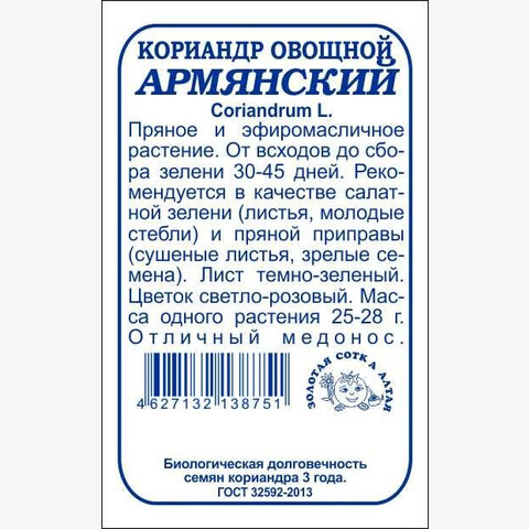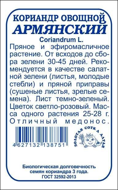 Пряное и эфиромасличное растение. От всходов до сбора зелени 30-45 дней. Рекомендуется в качестве салатной зелени (листья, молодые стебли) и пряной приправы (сушеные листья, зрелые семена). Лист темно-зеленый. Цветок светло-розовый. Масса одного растения 25-28 г. Отличный медонос.