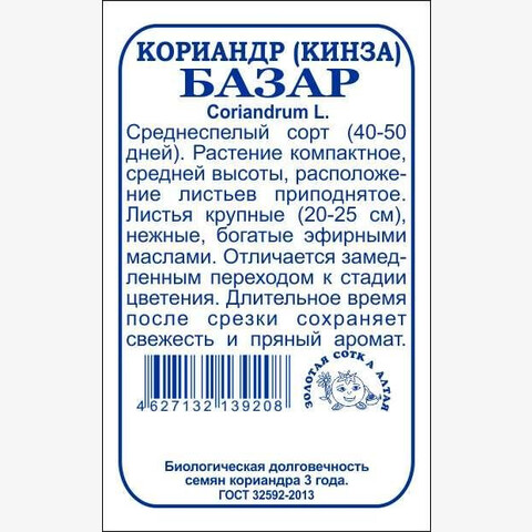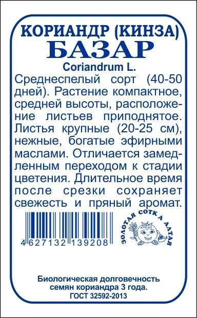 Среднеспелый сорт с длительным периодом хозяйственной годности. Растение высокое, компактное, полупрямостоячее. Листья зеленые, глянцевые, нежные, с насыщенным ароматом, богаты эфирными маслами, быстро отрастают, сохраняют ароматичность и привлекательный вид при транспортировке. Зелень используют в кулинарии, семена добавляют в маринады, пряные смеси и выпечку.