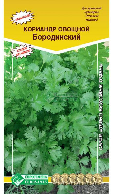 Кориандр – не только вкусная, но и очень полезная приправа, это популярная пряность с ярко выраженным ароматом, сочную зелень которой часто называют "кинзой". Период созревания зелени около 35-45 дней, семян - 80-90 дней. Компактная розетка зубчатых листьев вырастает до 70-75 см. Возможен регулярный подсев каждые 2 недели с ранней весны до середины лета. Отличается высокой морозоустойчивостью и устойчивостью к засухам. Для него характерна повышенная ароматичность, он отличный медонос, привлекает на участок пчел. Листья и семена однолетнего растения используются в кулинарии в качестве приправы, а также придают приятный аромат косметическим средствам. Кориандр также применяется в медицине как средство возбуждающее аппетит и улучшающее пищеварение. Растение требовательно к освещению - любит солнечные места. Для хорошего роста ему нужна рыхлая почва, богатая питательными веществами. Глинистая тяжелая почва для сорта не подходит.