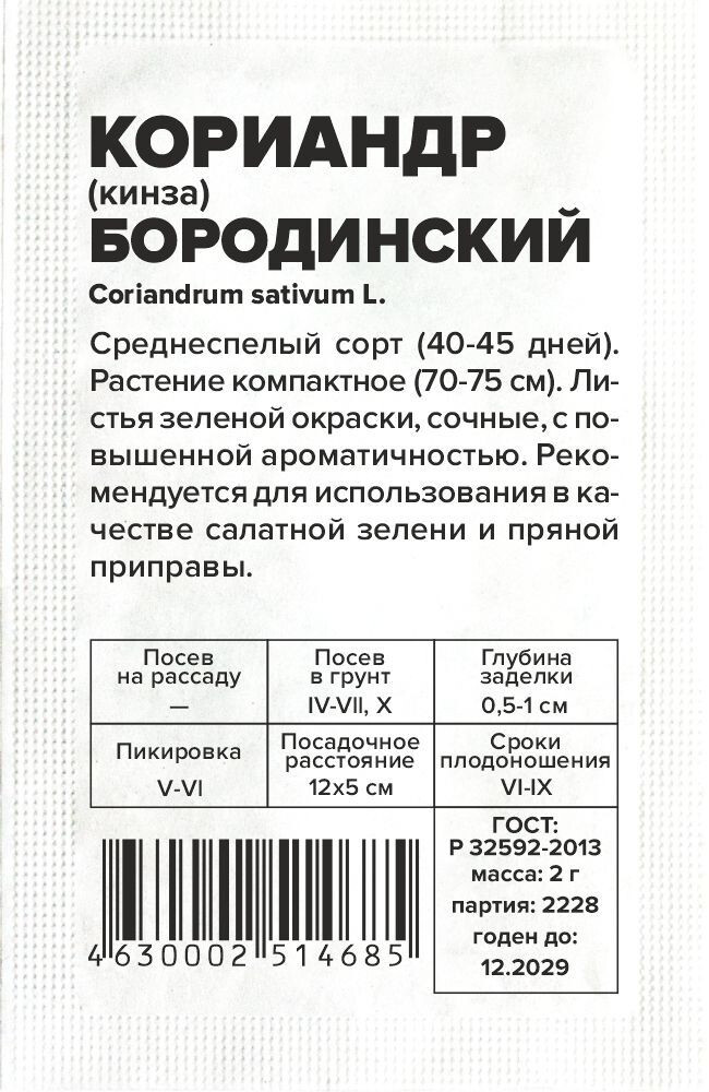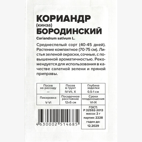 Среднеспелый сорт (40-45 дней). Растение компактное (70-75 см). Листья зеленой окраски, сочные, с повышенной ароматичностью. Рекомендуется для использования в качестве салатной зелени и пряной приправы. Место посадки: нетребователен к почвам, предпочитает слабокислые, плодородные грунты. Лучшие предшественники — картофель, огурец, капуста, морковь, свекла Освещение: обильное, выносит периодическое затенение Предпосевная подготовка: не проводится Сроки посева: сеют весной, когда температура почвы достигнет +6°С (апрель-май), летом (июль) и под зиму (октябрь) Посев на рассаду: не предусмотрено Посев в грунт: в неглубокие бороздки на уплотненный грунт, по 2-3 штуки, на глубину 0,5-1 см. Посадочный интервал 12х5 см. Затем посевы необходимо обильно полить и накрыть укрывным материалом или пленкой до появления всходов. Всходы появляются от 7 до 20 дней Пикировка/перевалка: не предусмотрена Уход: при перекопке осенью вносят перегной или компост, весной перед посевом — комплексные минеральные удобрения Сбор урожая: проводится выборочно, по мере формирования зеленой массы и в зависимости от назначения продукции. Если необходимы семена, то растения не срезают, оставляют до цветения и плодоношения