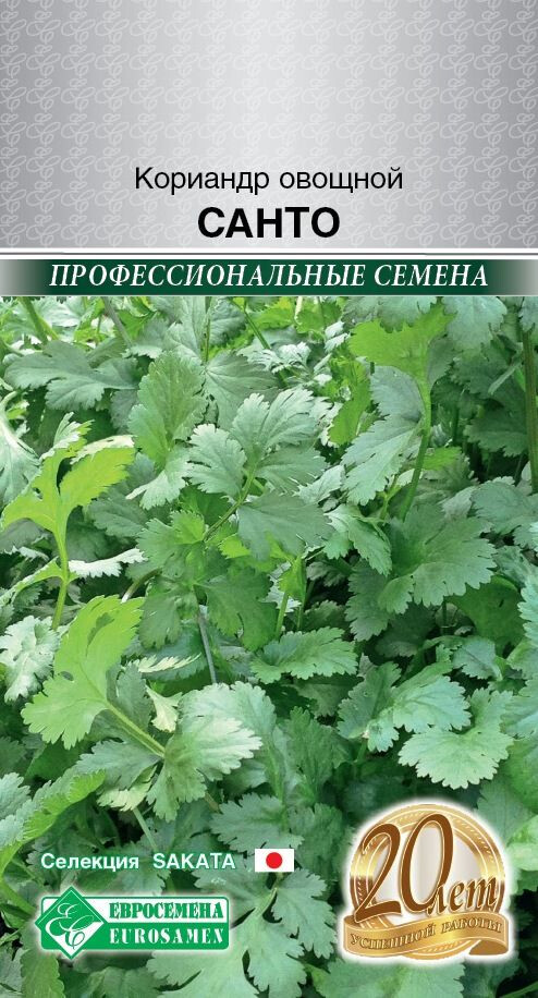 Кориандр – не только вкусная, но и очень полезная приправа, это популярная пряность с ярко выраженным ароматом, сочную зелень которой часто называют "кинзой". Санто- среднеспелый (40-50 дней от всходов до уборки зелени) сорт. Растение хорошо облиственное, формирует полуприподнятую розетку листьев высотой 50-60 см. Лист среднего размера, гладкий, с рассеченным зубчатым краем. Листья и молодые стебли используется в свежем виде для оформления блюд и салатов, в качестве приправы к мясным и рыбным блюдам. Из сушеных листьев и зрелых семян приготавливают пряные приправы. Подходит для выращивания в открытом и защищенном грунте. Возможен регулярный подсев каждые 2 недели с ранней весны до середины лета. Масса одного растения 25-35 г. Средняя урожайность 1,3 кг/кв.м. Оптимальная для прорастания семян температура почвы 20-25 °С