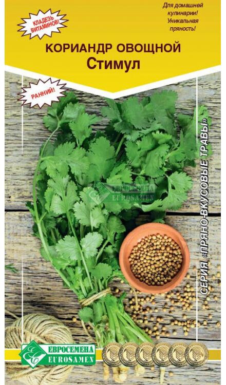 Кориандр – не только вкусная, но и очень полезная приправа. Древнегреческий медик Гиппократ называл кориандр природным лекарством, лечебное действие которого связывал с высоким содержанием фито питательных веществ и эфирных масел. Низкая калорийность (23-24 ккал) и достаточно пищевая ценность кориандра - незаменимые помощники в похудении, он выводит излишки жидкости и помогает обмену веществ. Кориандр Стимул- раннеспелый сорт, период от всходов до уборки на зелень 35-45 дней, семена созревают через 105-120 дней. Розетка компактная, прямостоячая, густо облиственная, высотой 25-30 см. Листьев в розетке 12-27 шт. Лист двояко перисто-рассеченный, темно-зеленый, глянцевый. Край лист глубоко надрезан. Черешок зеленый, иногда с антоцианом, составляет 1/2 длины листа. Масса растения 20-40 г. Листья в свежем виде используют в кулинарии. Семена добавляют как пряную приправу для ароматизации хлеба и кондитерских изделий, в маринады, при приготовлении пряных смесей.