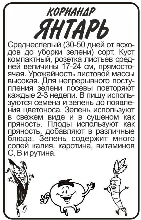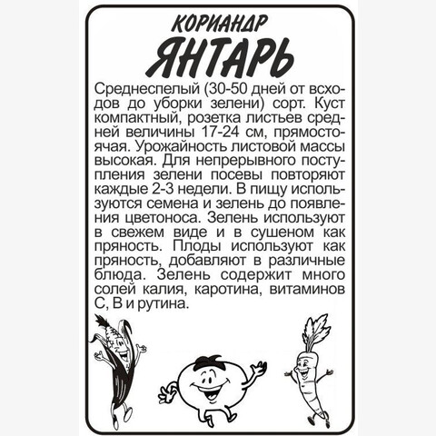 Среднеспелый (30-50 дней от всходов до уборки зелени) сорт для выращивании в открытом грунте и комнатных условиях как горшечная культура. Куст компактный, розетка листьев средней величины 17-24 см, прямостоячая. Урожайность листовой массы высокая. В пищу используются семена и зелень до появления цветоноса. Зелень используют в свежем виде и в сушеном как пряность. Плоды используют как пряность, добавляют в различные блюда. Зелень содержит много солей калия, каротина, витаминов С, В и рутина. Место посадки: нетребователен к почвам, предпочитает слабокислые, плодородные грунты. Лучшие предшественники — картофель, огурец, капуста, морковь, свекла Освещение: обильное, выносит периодическое затенение Предпосевная подготовка: не проводится Сроки посева: сеют весной, когда температура почвы достигнет +6°С (апрель-май), летом (июль) и под зиму (октябрь) Посев на рассаду: не предусмотрено Посев в грунт: в неглубокие бороздки на уплотненный грунт, по 2-3 штуки, на глубину 0,5-1 см. Посадочный интервал 12х5 см. Затем посевы необходимо обильно полить и накрыть укрывным материалом или пленкой до появления всходов. Всходы появляются от 7 до 20 дней Пикировка/перевалка: не предусмотрена Уход: при перекопке осенью вносят перегной или компост, весной перед посевом — комплексные минеральные удобрения Сбор урожая: проводится выборочно, по мере формирования зеленой массы и в зависимости от назначения продукции. Если необходимы семена, то растения не срезают, оставляют до цветения и плодоношения