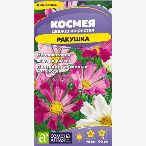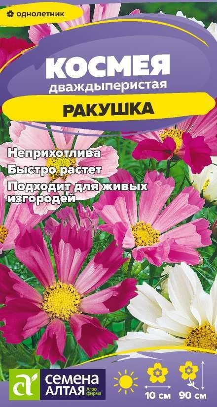 Декоративное растение с ажурными сильнорассечёнными листьями, высотой до 90 см. Цветки собраны в крупные соцветия-корзинки диаметром 7-10 см и расположены одиночно на концах стеблей. Оригинально свернутые лепестки белой, розовой, карминной окраски по форме напоминают морские ракушки. Используется для посадки на клумбах, в миксбордерах, на заднем плане цветников, для декорирования оград и стен строений. Светолюбивое, холодостойкое, засухоустойчивое растение. К почвам нетребовательно, но лучше растет на рыхлых питательных воздухо- и влагопроницаемых легких почвах. Посевы в открытый грунт проводят в мае или сеют на рассаду в апреле. Семена космеи прорастают только на свету, поэтому посев поверхностный, нельзя засыпать их или заглублять. Нужно лишь слегка вдавить семена в субстрат и увлажнить грунт из пульверизатора, вода должна быть немного теплой. Емкость с посевами накрыть пленкой и поместить в светлое место с температурой +15-18°C, пленку необходимо периодически снимать для проветривания. Семена космеи прорастают за 1-1,5 недели, пленку убирают. При появлении 2 настоящих листиков сеянцы пикируют. В открытый грунт рассаду высаживают в конце мая – июне, когда минует угроза возвратных заморозков. Посадочный интервал 35-40 см. Обильное цветение с июля до заморозков.