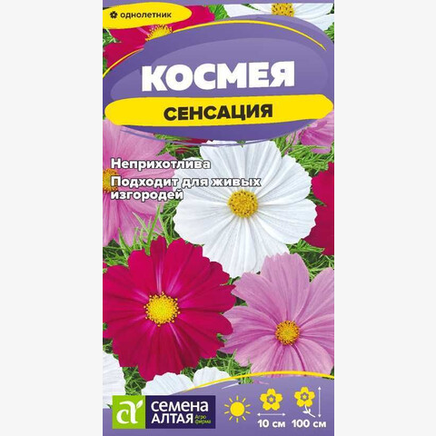 Градиентная окраска цветков превратит эту космею в красавицу Вашего сада. Окраска постепенно переходит от белой в центральной части лепестков к румяно-розовой по краям. Язычковые цветки собраны в крупные простые соцветия диаметром 8-11 см. Стебли густоветвистые прямостоячие, высотой до 110 см. Листья дважды перисторассеченные на нитевидные доли, что придает растению ажурный вид. Используется для посадки на клумбы, создания больших групп у оград и стен, формирования цветочных изгородей, на срезку. Светолюбивое, холодостойкое, засухоустойчивое растение. К почвам нетребовательно, но лучше растет на рыхлых питательных воздухо- и влагопроницаемых легких почвах. Посевы в открытый грунт проводят в мае или сеют на рассаду в апреле. Семена космеи прорастают только на свету, поэтому посев поверхностный, нельзя засыпать их или заглублять. Нужно лишь слегка вдавить семена в субстрат и увлажнить грунт из пульверизатора, вода должна быть немного теплой. Емкость с посевами накрыть пленкой и поместить в светлое место с температурой +15-18°C, пленку необходимо периодически снимать для проветривания. Семена космеи прорастают за 1-1,5 недели, пленку убирают. При появлении 2 настоящих листиков сеянцы пикируют. В открытый грунт рассаду высаживают в конце мая – июне, когда минует угроза возвратных заморозков. Посадочный интервал 35-40 см. Обильное цветение с июля до заморозков.