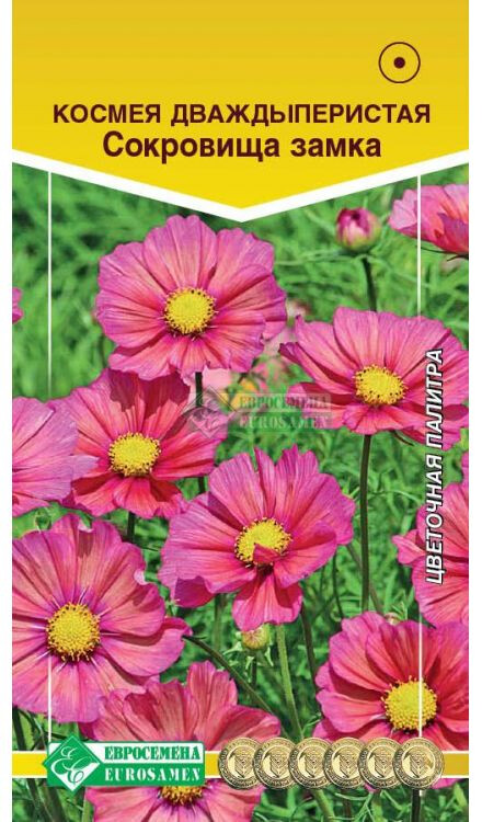 В настоящее время космос становится популярным среди цветоводов благодаря новым сортам. Они смотрятся привлекательно, при этом не страдают от ветра и не нуждаются в подвязке, ценятся в озеленении как культура, дающая возможность относительно быстро создать недорогой в исполнении и несложный в уходе цветник. Выгодно размещать это растение там, где необходимо создать цветущие все лето композиции на больших пространствах. Чаще всего высаживают большими группами, массивами, имитирующими участок природного луга, заполняют пространства между более высокими растениями. Космос Сокровища Замка - неприхотливый, яркий летник с обильным, продолжительным цветением, простой в уходе. Кусты с ажурной листвой выглядят пышно, нарядно. Многочисленные цветки-корзинки темной розовой окраски с малиновой горловиной наполнят цветники позитивом. Хорошими партнерами для него будут нивяник, колокольчики, циннии, флоксы, лилии. Увядшие соцветия удаляют для более активного образования новых бутонов. Высота растения-110 см Диаметр цветка-8 см