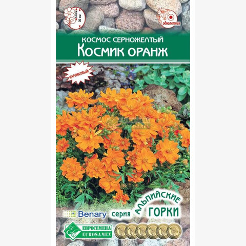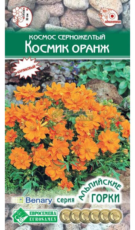 Cosmos sulphureus Cosmoc Orange Таким роскошным космос никогда еще не был. Это травянистое, холодостойкое растение, относительно засухоустойчивое, с красивой ажурной листвой и необыкновенной формы махровыми цветками, пылающими ярким оранжевым цветом. Необычайно привлекательно смотрится на рабатках и цветниках, альпийских горках и рокариях, привлекает восторженные взгляды своей новизной. Он упоит Вас своим нежным ароматом и незабываемыми махровыми цветами, которыми сможете наслаждаться до осени. Наибольшей декоративности достигает на солнечных местах. Это растение низкорослое, сочетает в себе неприхотливость и устойчивость к неблагоприятным условиям, а также длительное, обильное цветение. На протяжении всего лета Вас будут радовать воздушные шапки цветков на клумбах, рабатках, ослепительно смотрится на яркой зелени газона большими группами, вдоль изгородей в качестве бордюра. Высота растение-30 см Диаметр цветка-5-6 см