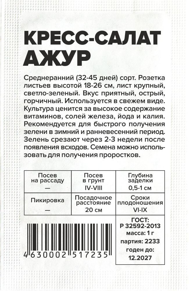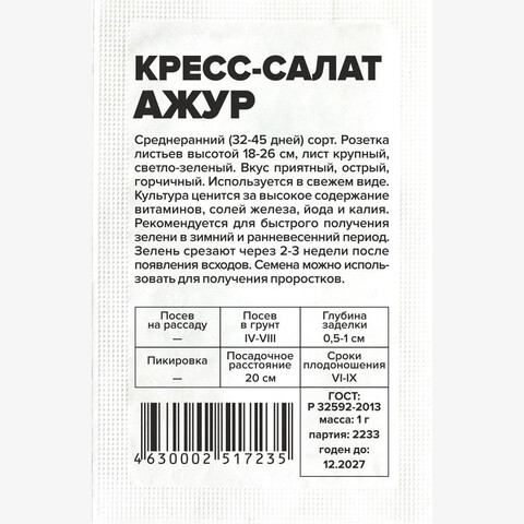 Среднеранний (32-45 дней) сорт. Розетка листьев высотой 18-26 см, лист крупный, светло-зеленый. Вкус приятный, острый, горчичный. Используется в свежем виде. Культура ценится за высокое содержание витаминов, солей железа, йода и калия. Рекомендуется для быстрого получения зелени в зимний и ранневесенний период. Зелень срезают через 2-3 недели после появления всходов. Семена можно использовать для получения проростков. Место посадки: нетребователен к почвам, при комнатном выращивании можно использовать любой влагоудерживающий субстрат: торф, минераловатные пробки, вату Освещение: обильное, выносит затенение Предпосевная подготовка: не требуется Сроки посева: в открытый грунт в апреле-августе, в комнатных условиях в течение всего года, посевы проводят с интервалом 7-10 дней для получения постоянного урожая зелени Посев на рассаду: не предусмотрен Посев в грунт: производят на глубину 0,5-1 см. Всходы прореживают на расстояние 20 см. На микрозелень высевают в плошки с небольшим количеством субстрата. Семена густо рассыпают по поверхности субстрата, увлажняют. Первые ростки, как правило, появляются в течение 1-2 часов. Пикировка/перевалка: не предусмотрена Уход: важно не допускать пересыхания субстрата Сбор урожая: проростки кресс-салата срезают в фазе семядольных листочков или при появлении первых настоящих листьев. У взрослых растений в пищу употребляют зеленную массу
