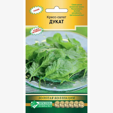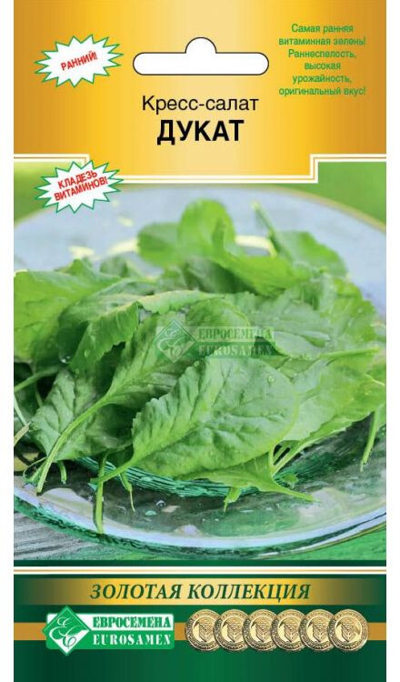 Кресс-салат не так хорошо знаком огородникам как, например, петрушка или укроп. Однако некогда его активно выращивали люди, живущие в разных уголках земного шара. Сам Гиппократ применял это растение для восстановления жизненных сил. Салат обладает многими полезными свойствами и неприхотливостью в уходе. Этот полезный овощ последнее время вызывает повышенный интерес у любителей укреплять здоровье посредством правильного питания и лечения народными средствами. Он имеет несколько названий: водяной кресс, посевной клоповник, цицмат и относится к семейству Крестоцветные, Родиной с Ирана. Дукат- самая ранняя витаминная зелень, сочетающая в себе раннеспелость, высокую урожайность и оригинальный вкус. Период от полных всходов до начала хозяйственной годности 18-22 дня. Рекомендуется для выращивания в открытом грунте. Зелень срезают через 2-3 недели после появления всходов. Листовая пластина нежная, зеленая, с пряным вкусом. Культура ценится за высокое содержание витаминов, солей железа, йода и калия. Вкусовые качества хорошие. Масса одного растения 15-20 г.
