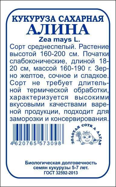 Сорт среднеспелый. Растение высотой 160-200 см. Початки слабоконические, длиной 18-20 см, массой 160-190 г. Зерно желтое, сочное и сладкое. Сорт не требует длительной термической обработки, характеризуется высокими вкусовыми качествами вареной продукции, подходит для заморозки и консервирования.