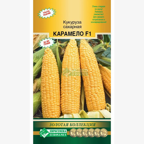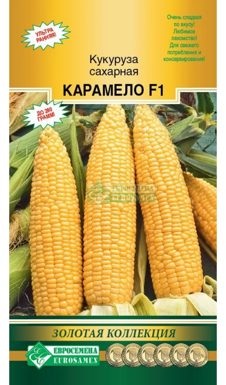 Кукуруза – один из самых древних однолетних злаков, известных человечеству. Найдены упоминания о том, что кукуруза была одомашнена почти 9 тыс. лет назад в Мексике. С тех пор кукуруза стала распространенным продуктом, ее выращивают во многих странах, а используют в пищу круглый год. Это чрезвычайно ценный пищевой продукт, богатый источник антиоксидантов, уступающий только пшенице. В отличие от других овощей, кукуруза не теряет своих полезных свойств после термической обработки. Карамело- ультра ранний гибрид очень сладкой кукурузы. Период вегетации составляет 60-70 дней. Гибрид с высокой урожайностью, широкий лист растения при правильной агротехнике позволяет накапливать сахара и формировать 2 и более полноценных початков. Початок длиной 20-22 см, вес до 280 грамм, зерно нежное, супер-сладкое, желтого цвета. Растение имеет относительно невысокий рост 130 см. Гибрид устойчив к разному роду заболеваний и вредителям. Рекомендуется для свежего потребления и консервирования.