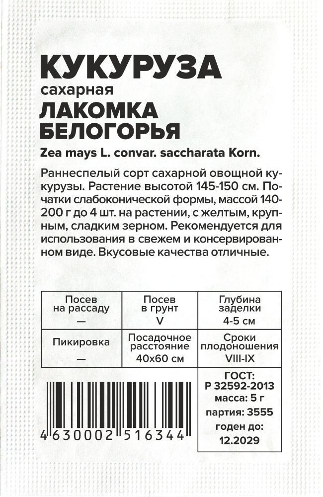 Раннеспелый сорт сахарной овощной кукурузы. Растение высотой 145-150 см. Початки слабоконической формы, массой 140-200 г до 4 шт. на растении, с желтым, крупным, сладким зерном. Рекомендуется для использования в свежем и консервированном виде. Вкусовые качества отличные. Место посадки: легкие, нейтральные, плодородные почвы. Лучшими предшественниками являются бахчевые культуры, томаты, перец и картофель Освещение: обильное, плохо переносит затенение Предпосевная подготовка: перед посевом семена рекомендуется замочить на сутки во влажной ткани Сроки посева: высевают в грунт при прогреве почвы на глубину посева до 10-12°С, среднесуточной температуре 15-17°С, когда минует угроза возвратных заморозков (апрель-июнь) Посев на рассаду: применяют в северных регионах (при длительности летнего периода короче 80 дней). Проводят за 25-30 дней до высадки в грунт Посев в грунт: семена размещают в бороздки на глубине 4-5 см, расстояние между растениями не менее 40 см, между рядами 60 см. Присыпают грунтом, хорошо уплотняют, обильно поливают и накрывают пленкой (или укрывным материалом) до появления всходов Пикировка/перевалка: высаживают в фазе 3 настоящих листьев в возрасте 30 дней Уход: 1-2 раза за сезон проводят подкормку полным минеральным удобрением. После обильных поливов и дождей рекомендуется аккуратно рыхлить почву вокруг растений