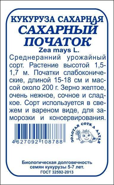 Среднеранний сорт, дружно формирующий высокий урожай. Растение высотой 1,5-1,7 м, с низким заложением первых початков. Початок слабоконической формы, длиной 15-18 см и массой около 200 г. Зерно ярко-желтого цвета, очень нежное, сочное и сахарно-сладкое. Сорт рекомендуется для потребления в свежем и вареном виде, заморозки и консервирования.