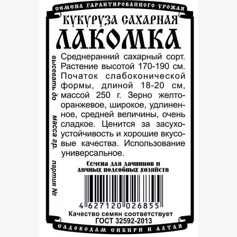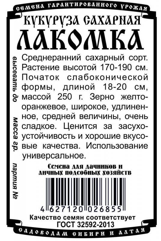 Среднеранний сахарный сорт. Растение высотой 170-190см. Початок слабоконической формы, длиной 18-20см, массой 250 г. Зерно желто-оранжевое, широкое, удлиненное, средней величины, очень сладкое. Отличная засухоустойчивость, хорошие вкусовые качества. Универсального использования.
