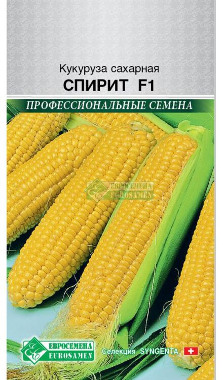 Сахарная кукуруза — одна из самых популярных у российских дачников огородных культур. Обладая сладким привкусом, отварные початки сахарной кукурузы любимы как взрослыми, так и детьми. Помимо приятного вкуса и высокой сытности, продукт содержит ряд витаминов и микроэлементов, а также огромный запас клетчатки. Кукуруза сахарная — полезный и высокопитательный продукт, вырастить который сможет любой начинающий садовод. Спирит F1- раннеспелый гибрид кукурузы сахарной, в российских условиях сорт показал себя как один из лучших во всех регионах возделывания культуры. Дружно созревающий гибрид с высокой товарностью початков, от посева до технической спелости 67-75 дней. Растения выровненные, высотой 140-165 см. Первый початок закладывается на высоте 50 см. Початок цилиндрической формы, длиной 20 см, диаметром 4,5-5 см, с 14-16 рядами зёрен светло-жёлтой окраски, массой 190 г. Рекомендуется для использования в варёном виде, для замораживания и консервирования. Урожайность кондиционных початков 7-9 кг/м2.