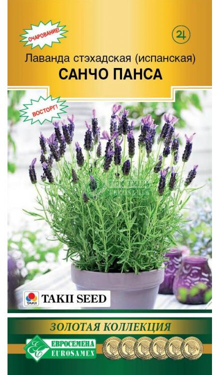 Лаванда – красивое и утонченное растение, романтичное и нежное, имеющее уникальный внешний вид и тонкий неповторимый аромат. Ее часто применяют как добавку к блюдам и десертам, напиткам, а из ее эфира делают духи и различные ароматические жидкости. Лаванда стэхадская принадлежит к семейству Яснотковые- популярный вид лаванды, выглядит более пышно, чем лаванда узколистная, и имеет оригинальные соцветия с характерными крылышками. Санчо Панса - новинка предстоящего сезона, образующая компактное, округлое растение с длительным периодом цветения, это первый французский сорт, выведенный специально для выращивания в контейнерах. Растение неприхотливое, быстрорастущее, продолжительно цветущее, может выращиваться и как однолетник, и как многолетник, формирующее быстро ароматные цветки, сохраняя их долгое время в цвету. Цветки растения розовато-фиолетового цвета. Чашечка от 4 до 6 мм длиной. Санчо Панса идеально подходит для смешанных контейнеров, где сможет дарить своим, менее удачливым соседям, свой насыщенный и неповторимый аромат.