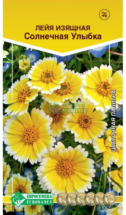 Лейя – род многолетних растений семейства Сложноцветные, являющихся выходцами из Южной и Юго-Восточной Азии и культивируемых в средних широтах как однолетник. Высоко декоративная культура пользуется спросом садоводов из-за ярких цветов и способность переносить суровые условия произрастания. Растение цветет на протяжении всего лета, добавляя красок цветнику. В декоративном садоводстве используют только один вид растения – лейя изящная. Солнечная Улыбка - растение с цветками золотисто-желтого окраса с белой каймой по краю лепестков, применяется для декорирования садового участка. Посадки ее уместны практически во всех уголках сада, ведь яркие крупные корзинки желтого оттенка делают любой участок красочным, преображают его. Используется лейя для создания живописных композиций на клумбах. Она гармонично смотрится с другими цветущими растениями с выразительными бутонами желтых, оранжевых, белых, коралловых тонов, ее используют для оформления каменистых горок, рабаток, декорирования бордюров, для составления букетов. Высота растения-35 см Диаметр цветка-5 см