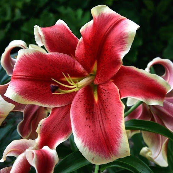 Лилия ОТ гибрид African Lady (Африкан Лейди) - цветки – яркие, насыщенной вишнево-красной окраски, с контрастной желто-кремовой каймой. Лепестки слегка отогнуты назад. Длинные тычинки желтоватого оттенка с бордовыми пыльниками выгодно дополняют композицию цветка. 😍