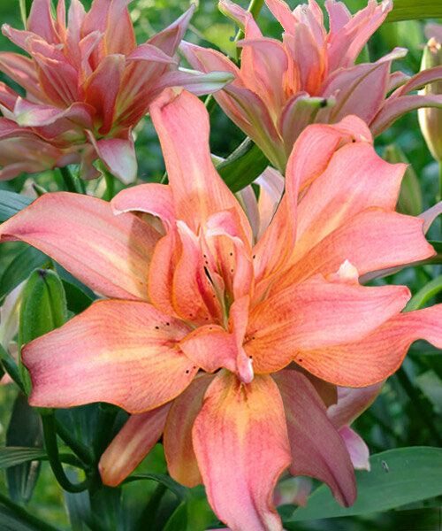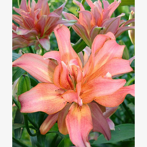 Размер луковицы 16-18см. Тип лилии - махровый азиатский гибрид ЛилияАфродита Aphrodite относится к неприхотливым гибридным густомахровым сортам и характеризуется крупным махровым соцветием, удлиненными зелеными листьями и крупным стеблем. Цветонос из земли вырастает в среднем на 80 см. Эта махровая лилия отличается желтыми пыльниками и розовыми или нежно-желтыми лепестками. Средний диаметр соцветия – от 15 до 20 см.