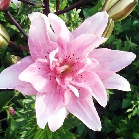 Лилия Бентли. Цветок махровый, кремово-розовый с розовым кантом и кончиками. Без пыльцы!!! Без аромата. Пышных бутонов у лилий можно добиться, соблюдая обычные правила ухода: в первый год лилиям не нужна весенняя подкормка, удобрения вносятся разово за сезон, после цветения. Но это лишь в том случае, если перед посадкой вносилось удобрение. Хорошо зимуют.