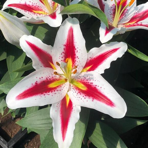 Совершенство! Поразит красотой четких линий и пропорций. Белоснежные лепестки четко украшены малиново-бордовыми мазками, переходящими в желтую капельку к основанию лепестка. Темный редкий крап украшает совершенство.