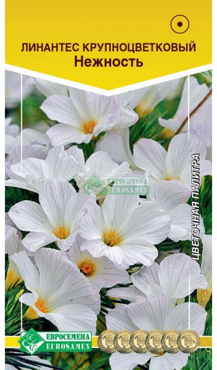 Линантус – однолетнее травянистое растение, относящееся к семейству Синюховые, Родина – Северная Америка, Чили. Растения данного рода в естественной среде можно обнаружить на каменистых участках, по берегам водоемов, на лесных опушках. Ценится данная культура за необычный внешний вид, так как в нем гармонично сочетается мелкая игольчатая листва и крупные цветки, которыми куст обильно усыпан на протяжении нескольких месяцев. Нежность - самый распространенный в декоративном садоводстве вид линантуса с сильно ветвящимися тонкими стеблями, благодаря которым имеет вид пышного ковра. Цветки белого цвета с оттенком лаванды, который проявляется больше при прямом посеве в открытый грунт. Несмотря на скромный внешний вид линантусы нашли применение в ландшафтном дизайне. Эти цветущие невысокие кустики часто применяются для украшения сада. Наиболее выигрышно они смотрятся на переднем плане цветников, а также по краям клумб. Применяют в одиночных и смешанных посадках, для создания альпийских горок, рокариев, альпинариев. Эффектно смотрятся карликовые виды в красивых вазонах, кашпо. Высота растения-30 см Диаметр цветка-3 см